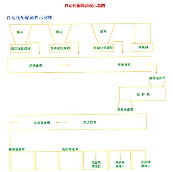 自動配煤流程通常選用2-8種煤經進料倉——輸送帶——篩分破碎系統(可選)——特制攪拌機——成品煤輸送皮帶(高架皮帶輸送機)——成品煤